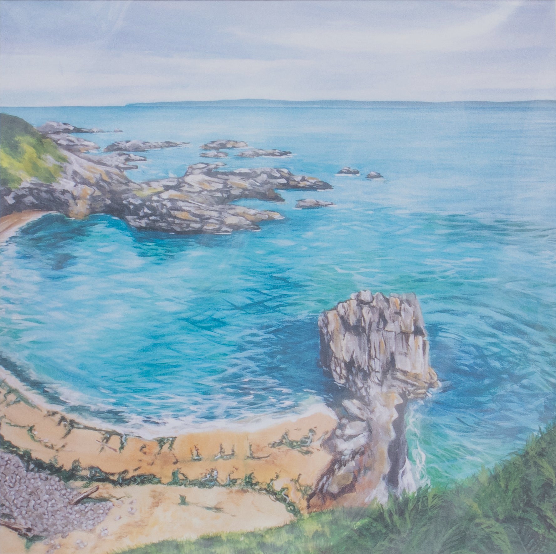 "Worked from a photograph, I couldn't resist the bird's-eye-view of this quaint little beach. I have memories of my husband jumping from the big rock at high tide!"