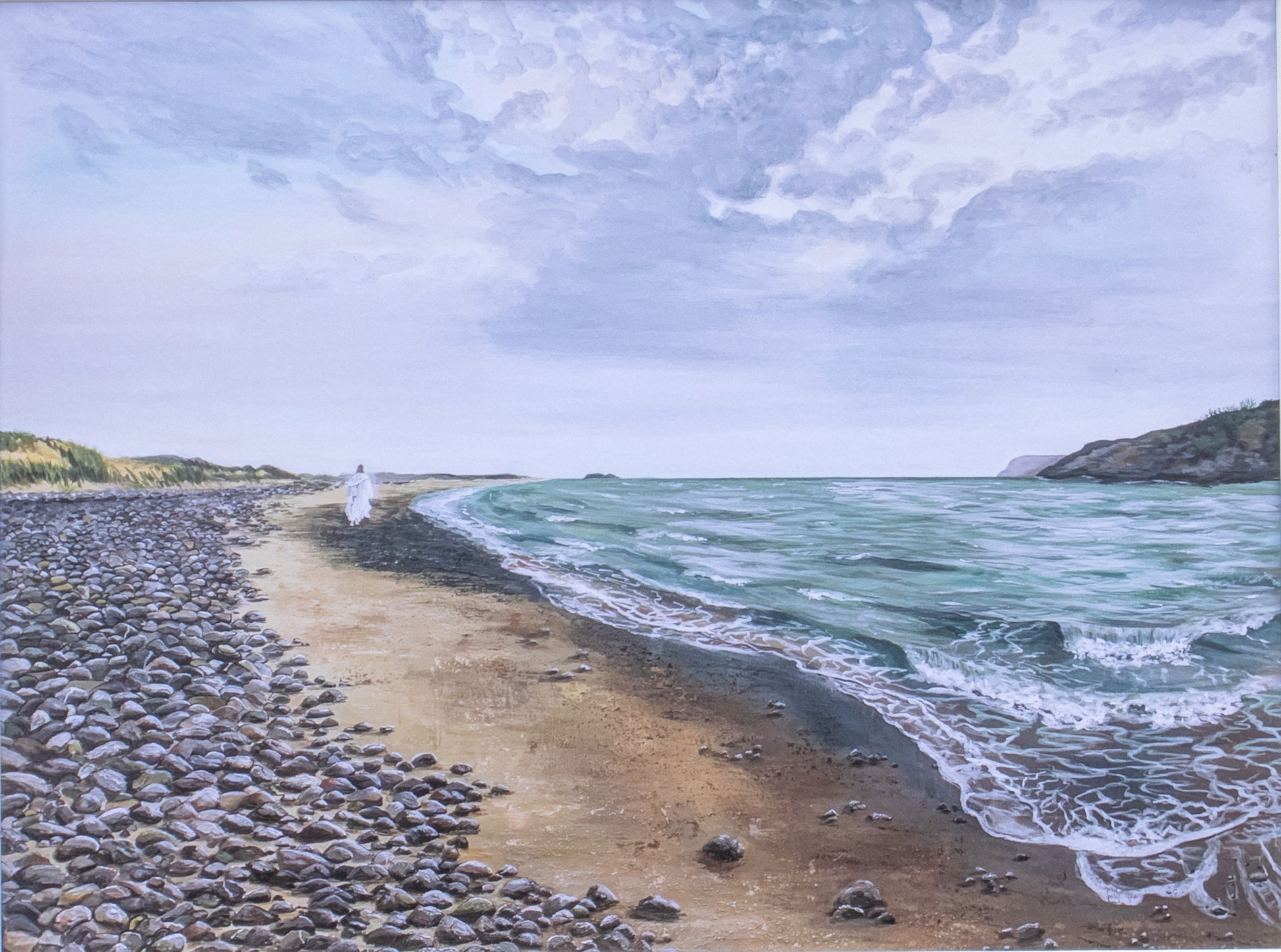 This painting portrays Christ walking along a pebbled beach, but it represents far more. Inspired by 2 Nephi 26:33, it reflects His presence in all things—the sea as the living waters, the pebbles as the rock of our salvation.